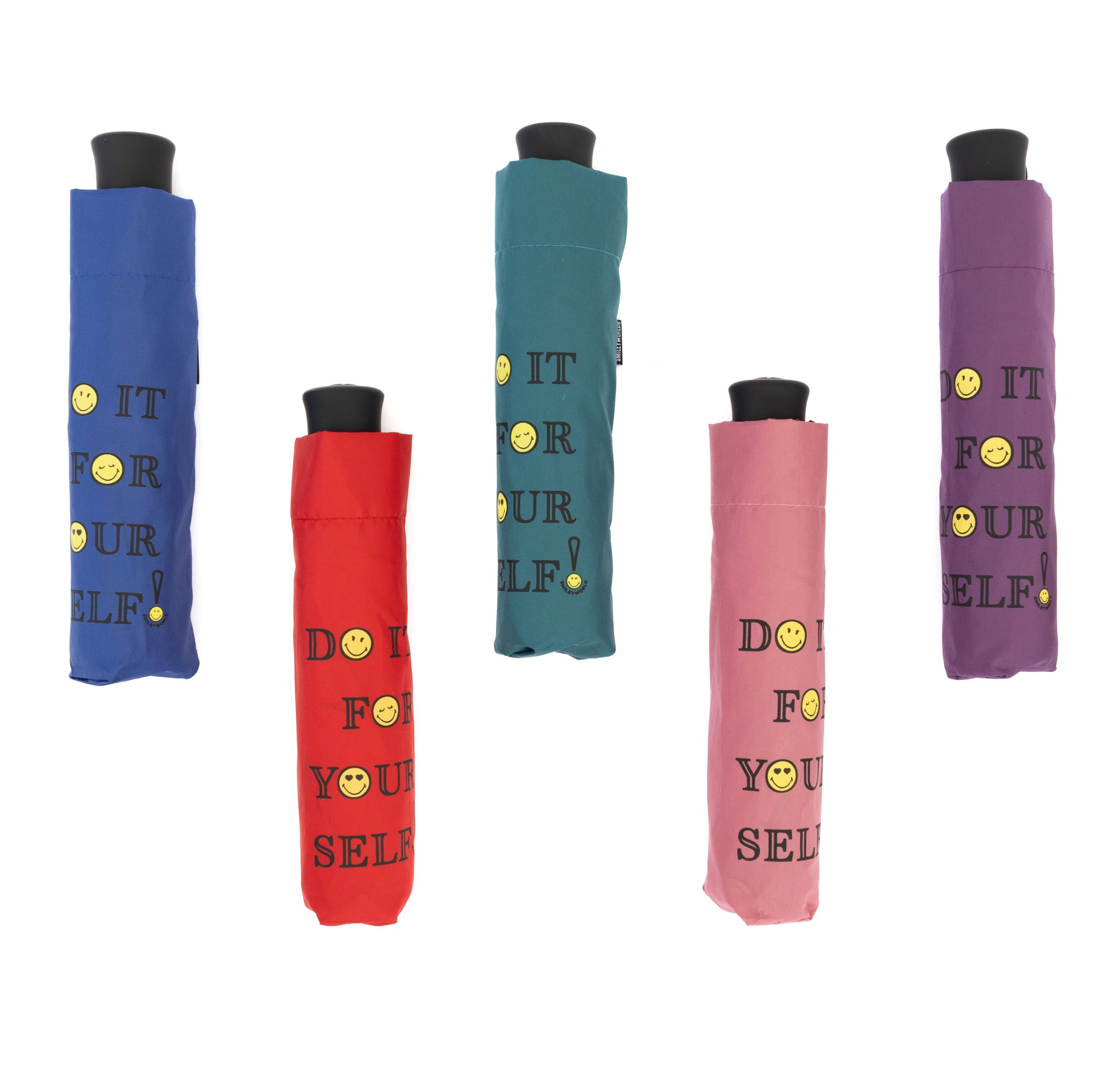 SMILEY WORLD SuperMini Manual Windproof, size 54 cm, 8 black ribs+ fiberglass, black frame, plastic handle with PU coating , Fabric PONGEE with Printed Designs with Smiley World Logo