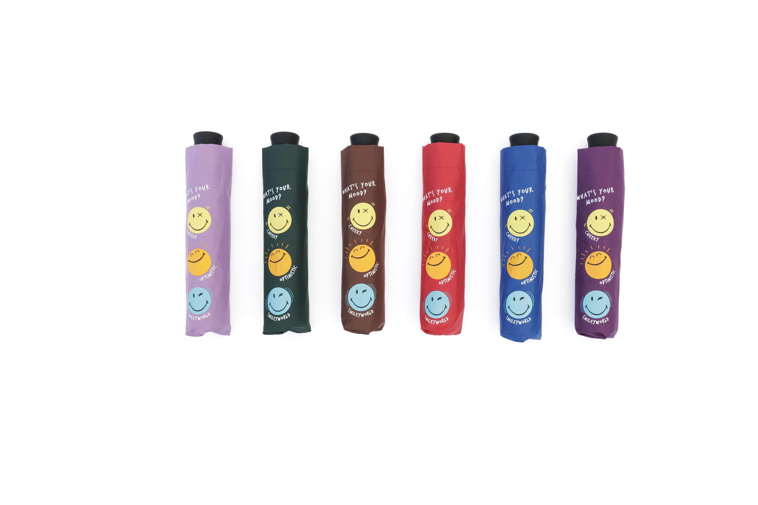 SMILEY WORLD SuperMini Manual Windproof, size 54 cm, 8 black ribs+ fiberglass, black frame, plastic handle with PU coating , Fabric PONGEE with Printed Designs with Smiley World Logo